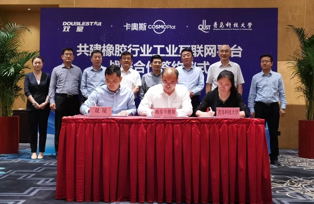 6月8日下午, 财神捕鱼 与双星集团、海尔卡奥斯在海尔洲际酒店举行共建橡胶工业互联网平台战略合作签约仪式。校长陈克正、海尔集团总裁周云杰、双星集团董事长柴永森,市国资委主任、党委书…