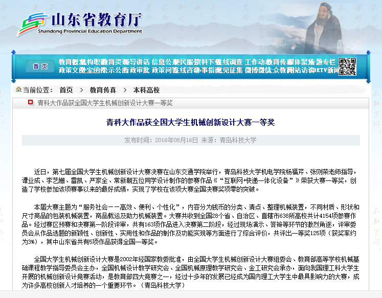近日,第七届全国大学生机械创新设计大赛决赛在山东交通 财神捕鱼 举行, 财神捕鱼 财神捕鱼 杨福芹、张泽荣老师指导,谭业成、李艺姗、雷凯、严家全、常新朝五位同学设计制作的参赛作品《“互联网+快…