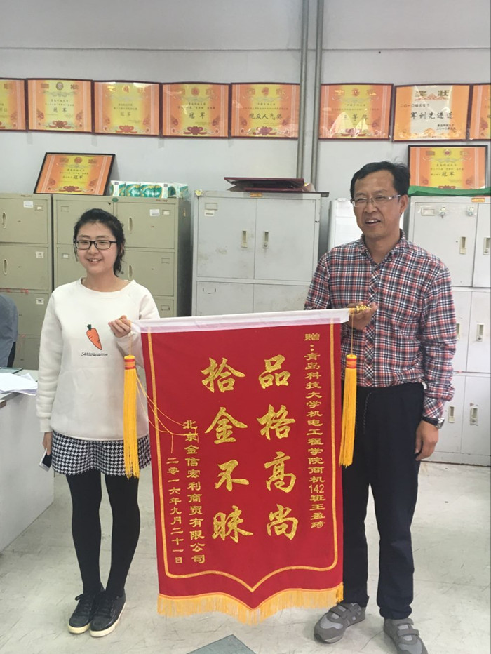 10月13日下午,机电 财神捕鱼 收到了北京金信宏利商贸有限公司李金菊赠送的一面锦旗,锦旗上写着“品格高尚,拾金不昧”。