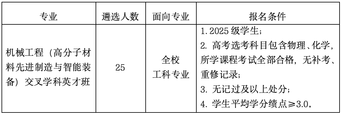 “橡胶工业黄埔”鲜明特色,根据《关于开展交叉学科英才班及产教融创卓越班建设工作的通知》、《高分子材料先进制造与智能装备交叉学科英才班建设方案》,现组织开展机械工程(高分子材料先进制造与智能装备)交叉学科英才班(以下简称交叉学科英才班)的招生遴选工作,相关事宜通知如下: