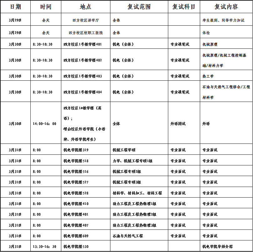 说明: 3月29日报到时,请在报到处--机电 财神捕鱼 举牌位置填写报到登记详情表;3月30日专业课考试科目《机械原理》的考生请自带绘图工具;3月31日专业面试分组名单详见当天机电 财神捕鱼 楼一楼张贴,各复试专业按照公布名单的顺序依次进行,政审表在面试时请交于各组政审老师;529房间为考生面试候场处。