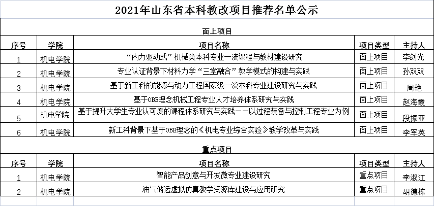 根据 财神捕鱼 《关于组织开展2021年山东省本科教学改革研究项目立项及管理工作的通知》要求,机电 财神捕鱼 开展了省级教改项目评审工作,经项目负责人申报, 财神捕鱼 评审,共推荐新立项8项,现将结果公示如下: