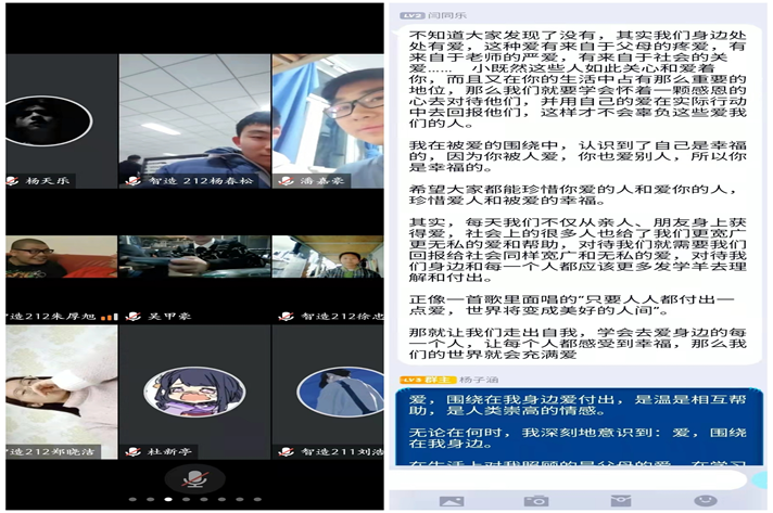 本次活动由各班心理委员组织,通过线上视频会议的形式,创造积极活泼的分享氛围。各班级心理委员围绕“善爱我”主题开展相关讲解,同时同学们也用自己的观点,以善爱的主题为核心,对自己的人生经历进行了深刻感人的分享。分享过程中同学们积极表达,大胆提问,气氛极为活跃。每个文字符号都见证了同学们踊跃参与的热情。最后各班心理委员对本次交流进行了总结,同学们也在此次会议中体会到了善爱自己和他人的快乐。