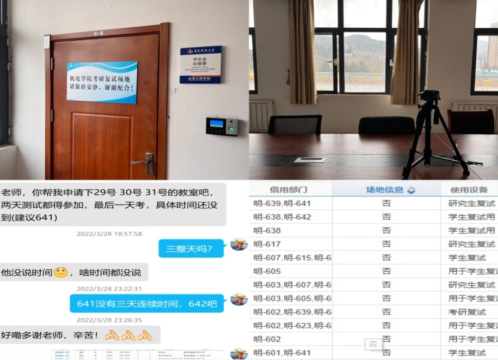 领导高度重视,进行需求征集和统筹安排,启用了绘图教室、办公室、会议室等作为考研复试临时场地,复试学生可联系辅导员老师预约使用,全力保障考研学子复试顺利进行。