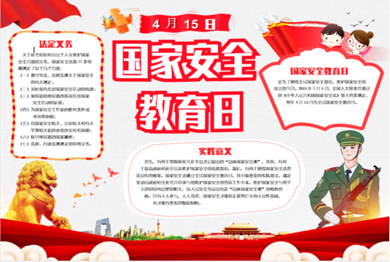 紧紧围绕"国家安全,人人有为"的主题开展“国家安全日”系列教育活动,提高学生安全意识,营造校园安全氛围,提高防范和抵御风险的能力。