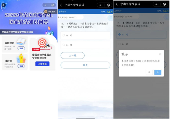 组织同学们参与“全国高校学生国家安全知识问答活动”,全面普及学生安全意识,强化安全教育,大力营造校园安全文化氛围。知识题目涉及国家安全、网络安全、疫情防控、宿舍安全和食品安全等方面,2000余人积极参与知识竞答。此次答题活动具有很强的现实意义,在一定程度上进一步提升学生安全知识储备,提高了同学们学习安全知识的主动性与积极性。要切实增强学生的总体国家安全观和责任感,把校园安全工作抓早抓小、抓实抓细,营造时时讲安全,事事讲安全,人人讲安全,人人抓安全,保证人人安全的良好校园氛围。