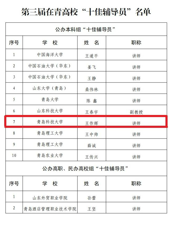 辅导员王作辉获评在青高校“十佳辅导员”荣誉称号。