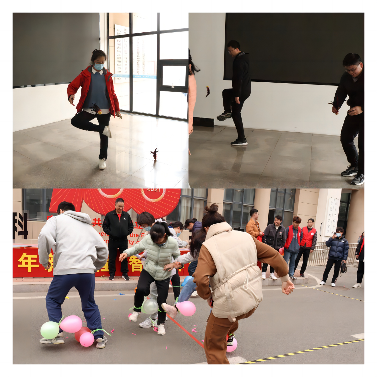 本次趣味运动会共分五个项目:拔河、跳大绳、踢毽子、踩气球、搭积木。老师们互相鼓励、互相帮助,发扬了团结协作的精神风貌,将趣味运动会气氛推向高潮,运动场上不时响起阵阵加油呐喊的笑声与掌声。