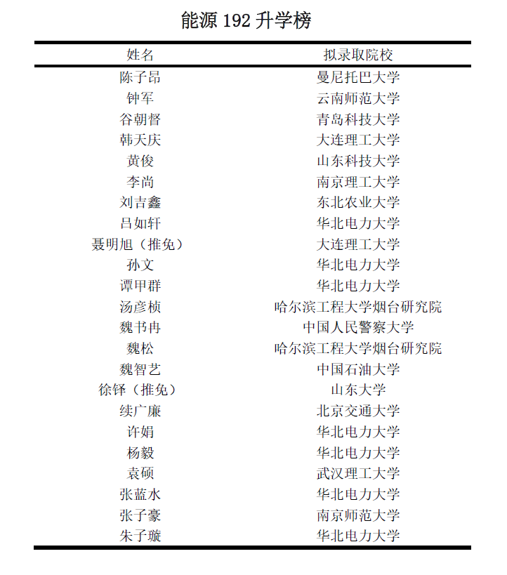 能源192班共30人,23人成功上岸并分别被大连理工大学、山东大学、华北电力大学、哈尔滨工程大学、中国石油大学、南京理工大学、武汉理工大学、北京交通大学、南京师范大学等多所知名高校录取,上岸率76.7%,其中985、211高校成功上岸18人(60%)。