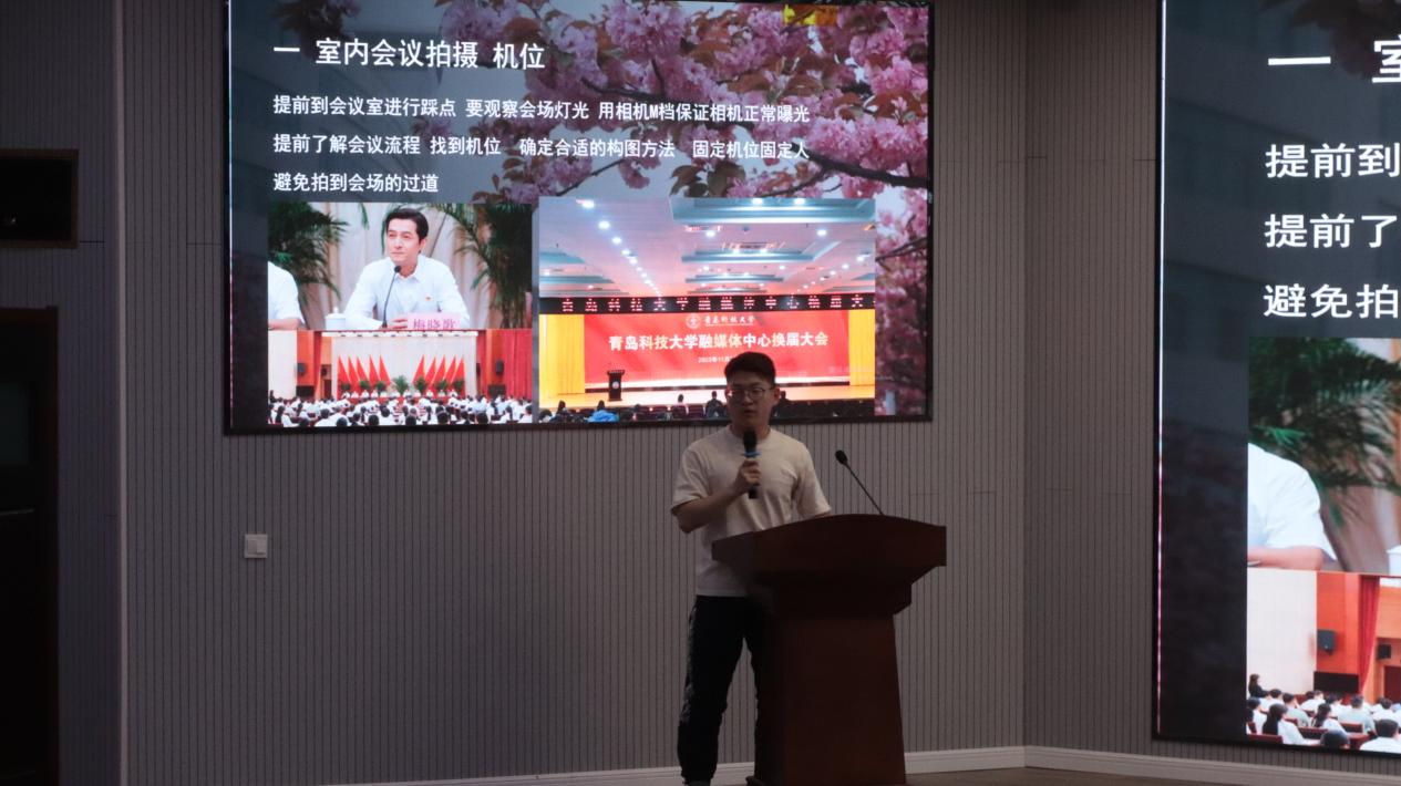 融媒体中心刘嘉洋就拍摄工作为同学们提供了切实可行的技巧建议。首先讲解了同学们有关拍摄机位的相关知识,随后展示会场拍摄、特写拍摄的技巧。最后讲解了照片的调整技巧及对照片的要求。
