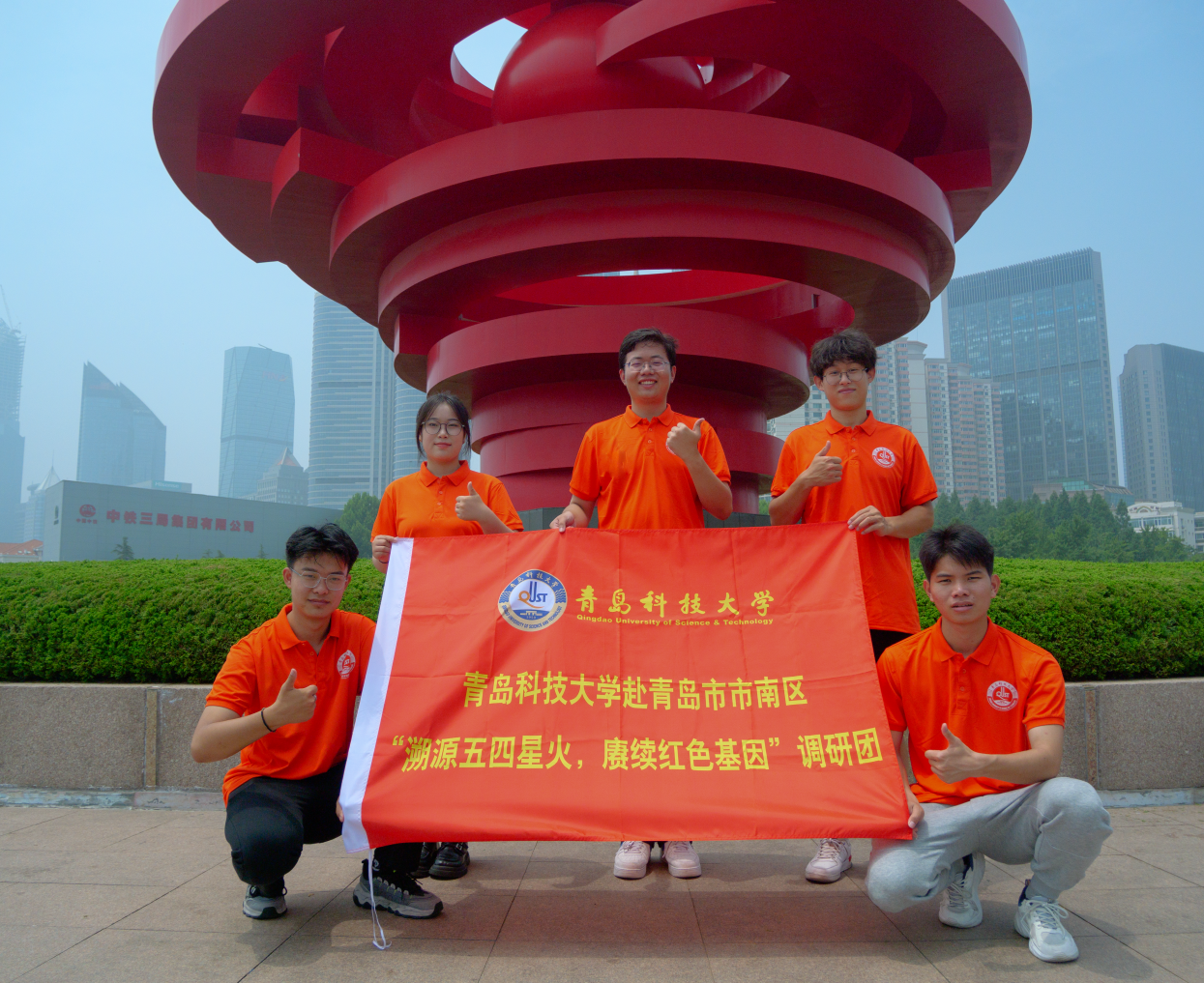 调研团成员来到五四广场,重温五四运动,体悟革命先辈的精神气节。“五月的风”雕塑是青岛作为‘五四运动’导火索的标志性建筑,简洁的线条和厚重的质感表现了一股腾空而起的劲风,其以盘旋上升的造型,象征着红色之火在革命之风中熊熊燃烧,延绵不绝,给人以奋进向上的力量,仿佛置身于那段历史的洪流之中充分展现了“五四运动”反帝反封建的爱国主义情怀与蓬勃腾升的民族力量。