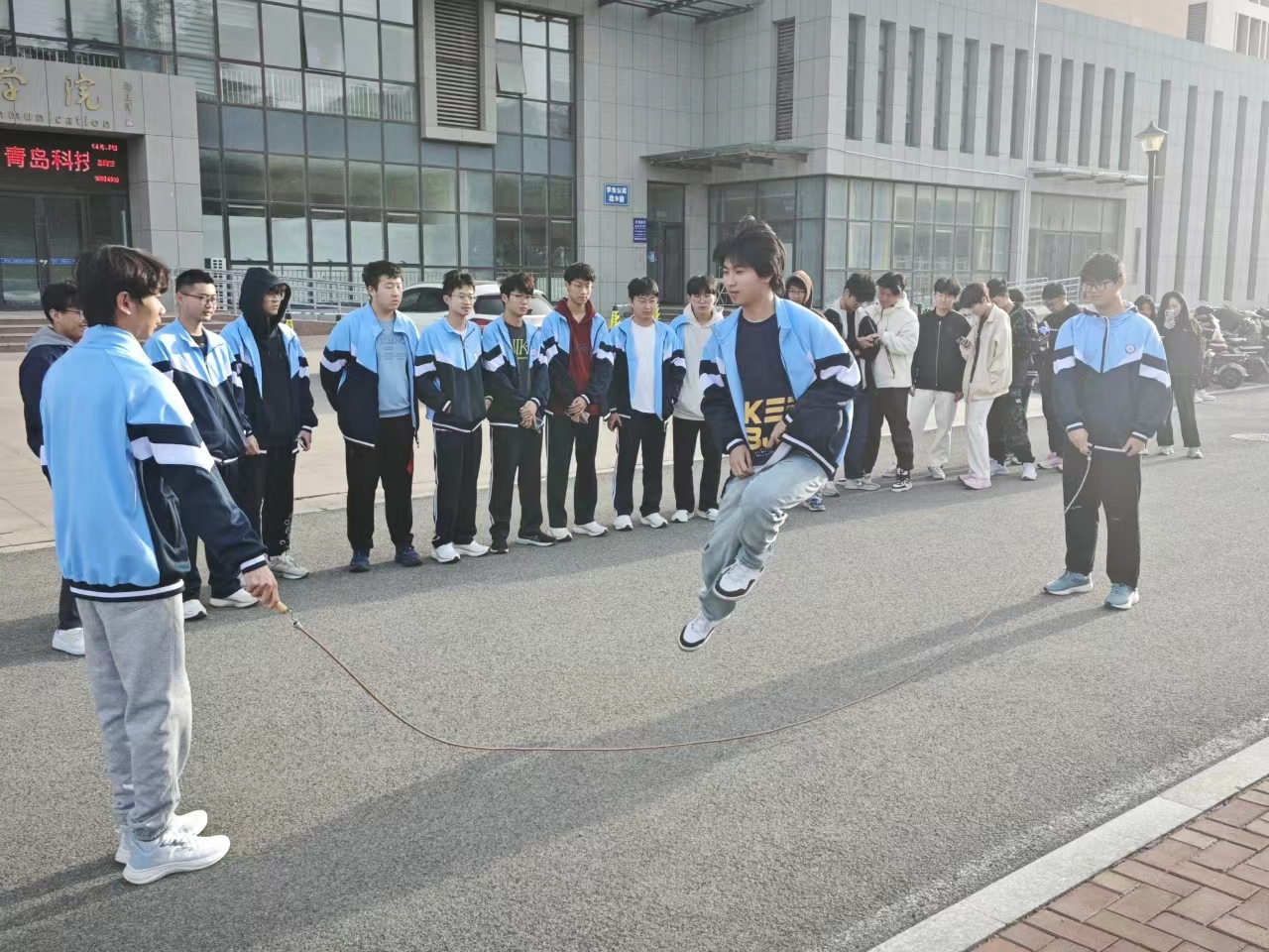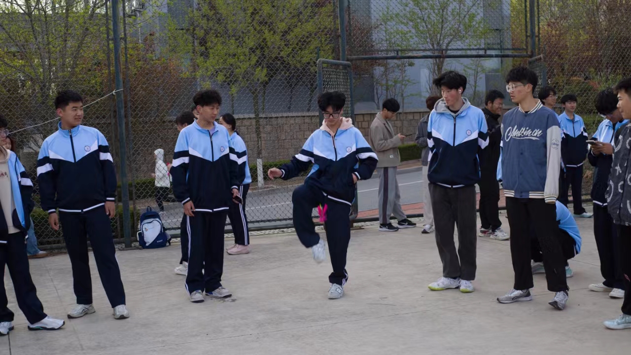 在北苑操场开展跳大绳、踢毽子、广播体操活动,2023级全体学生及辅导员参加。
