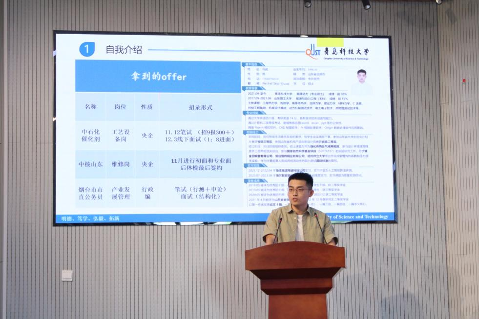 聂文雪,已成功签约济钢集团有限公司,她介绍了自己研究生三年期间的个人成果,鼓励同学们在校期间学习各类技能,同时对求职简历的制作与投递给出建议,并总结分享了自己面试过程中所用到的面试技巧。
