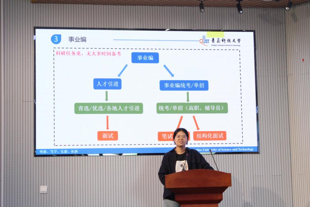 专职教师,她结合自己备考公务员与事业编的经历,对行政编制岗位进行了详细介绍,建议同学们选择岗位时要主动挖掘各类资源,重视信息收集整理,同时保持良好的心态,坚定自己的选择,切忌心浮气躁,最后与大家进行了信息分享。
