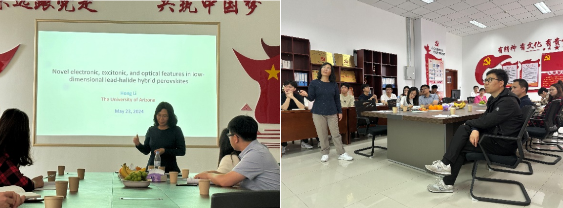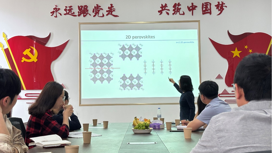 二维卤化钙钛矿与其三维结构相比,具有更好的光稳定性和化学稳定性,因此吸引了人们的极大的研究兴趣。在过去几年中,人们不断尝试通过调控二维钙钛矿晶体中有机间隔分子的化学性质,以将其更好的应用于发光或光伏材料。然而,目前的工作大多集中于研究无机-无机或有机-有机之间的界面相互作用,却忽略了有机阳离子的前沿分子轨道与无机框架的带边态之间电子耦合作用诱发的一系列重要特性。有机成分和无机成分之间的这种强耦合作用可能会产生新的电子、激子和光学特性,从而进一步拓宽钙钛矿材料实际应用的范围。Li Hong教授为大家详细讲解了二维和一维卤化钙钛矿中无机钙钛矿层和有机间隔层之间电子耦合相关的研究工作,其中有机间隔层由具有π共轭骨架的(二)铵阳离子组成。研究结果表明,通过调整有机阳离子的共轭度和极化性,以及有机成分和无机成分之间的结构接近度和电子耦合,可以实现各种电子和激子行为。同时,与各位老师学生就研究中遇到的问题进行了交流,报告内容精彩,师生收益颇丰。