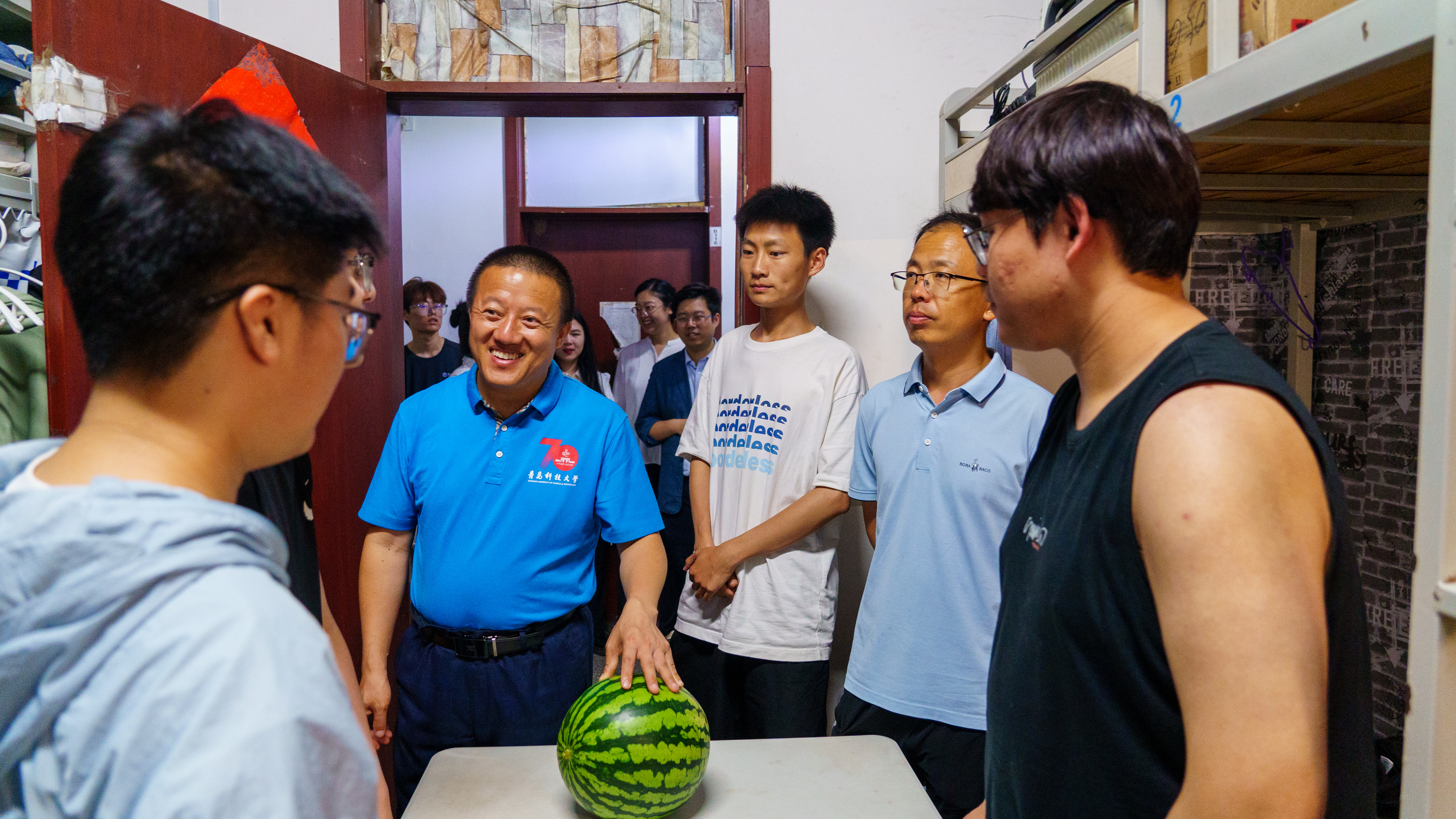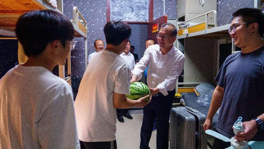 党委书记任允晓、党委副书记兼副院长杨小明、副院长杨化林、学工办主任逄柏鹏及全体辅导员走访毕业生宿舍,为即将离校的毕业生送上清甜的西瓜,带去温暖与祝福。