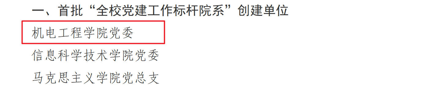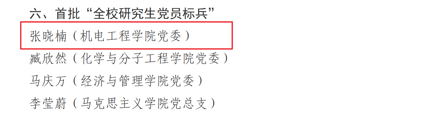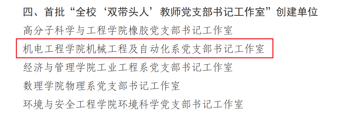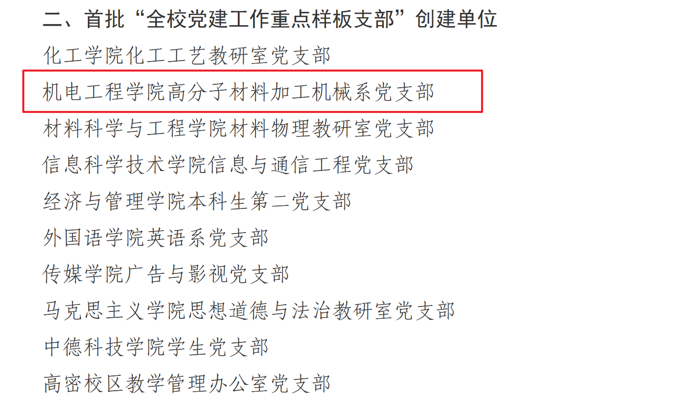 党委入选首批“全校党建工作标杆院系”创建单位,高分子材料加工机械系党支部入选首批“全校党建工作重点样板支部”创建单位,机械工程及自动化系党支部书记工作室入选首批“全校‘双带头人’教师党支部书记工作室”创建单位,2022级硕士研究生张晓楠入选首批“全校研究生党员标兵”。