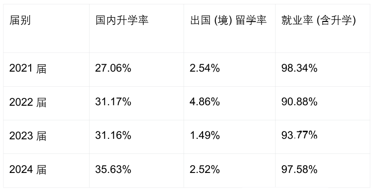在国内升学、出国(境)留学及就业等方面均取得显著成效,呈现出良好的发展态势与上升趋势。具体数据如下表所示:
