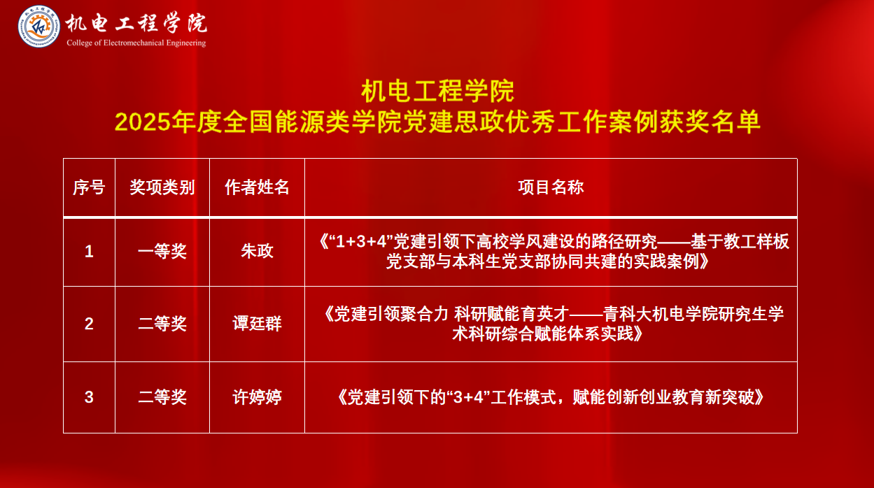 共获奖3项。其中,朱政申报的《“1+3+4”党建引领下高校学风建设的路径研究——基于教工样板党支部与本科生党支部协同共建的实践案例》荣获一等奖,谭廷群申报的《党建引领聚合力、科研赋能育英才——青科大机电 财神捕鱼