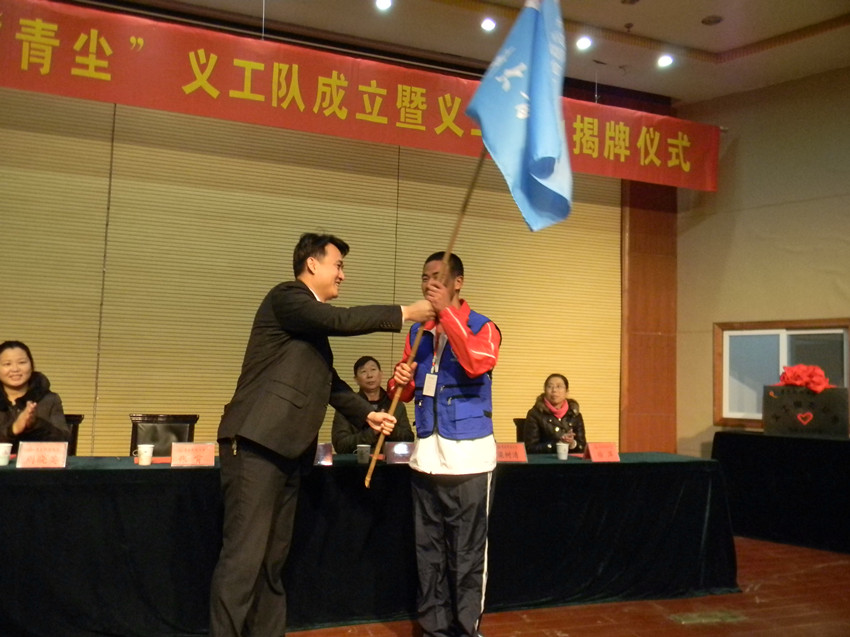 党总支副书记兼副院长张霄为“青尘”义工队授旗。