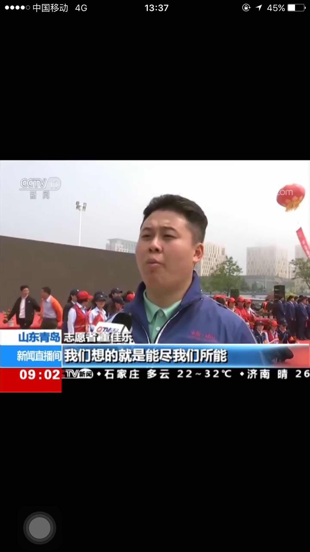 能源154班、崂山校区学生社团联合会主席董佳乐作为文明交通志愿者代表作了发言并接受了媒体采访。5月14日,中央电视台13新闻频道《新闻直播间》栏目播出《上合青岛峰会6月举行 近2万名城市运行志愿者上岗》。