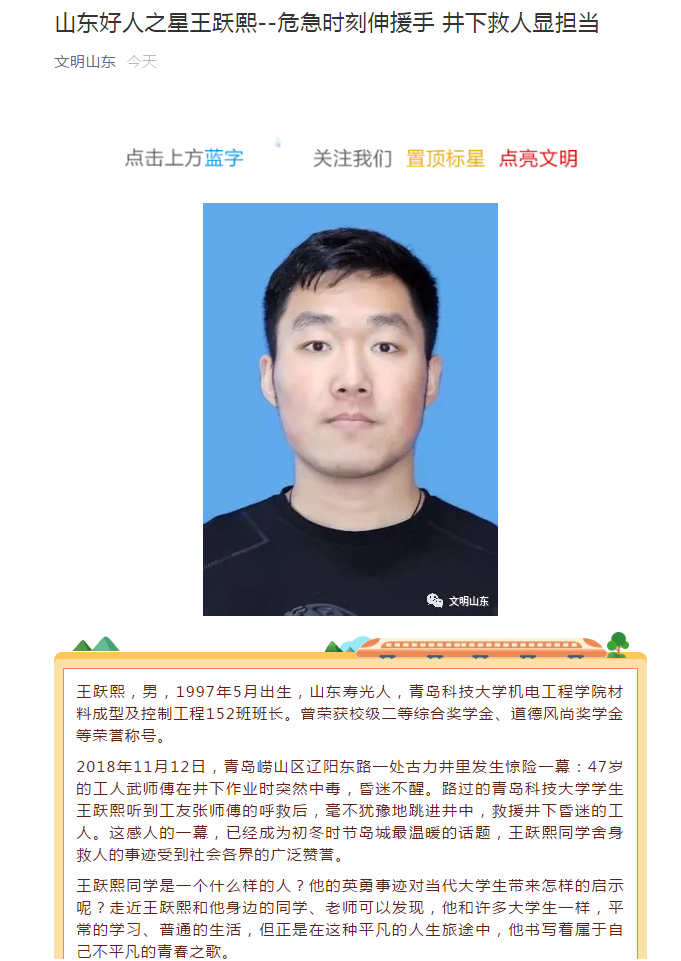 成型中韩152班班长王跃熙同学获评山东好人之星。王跃熙同学在危急时刻伸出援手,英勇井下救人,受到社会各界广泛赞誉,展现了新时代机电学子新青年新形象。