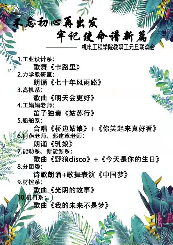 的美好祝福。何燕和郭建章两位院长的朗诵《乳娘》将联欢会推向了高潮。分团委的《中国梦》以歌曲、舞蹈、新闻主持、现场报道相互交融的新颖独特方式将分团委一年来辛勤的工作和取得成绩呈现给每位老师,引起了一阵阵热烈的掌声。王娟娟老师笛子独奏《姑苏行》,船舶系的小合唱《桥边姑娘》和《你笑起来真好看》、能动系、新能源系的歌舞《野狼disco》和《今天是你的生日》、材控系的小合唱《光阴的故事》、机自系的小合唱《我的未来不是梦》,一首首动听的乐曲,一段段优美的旋律,展现了各教研室老师的多才多艺,活力迸射的精神面貌。