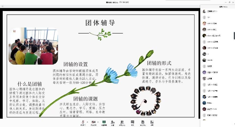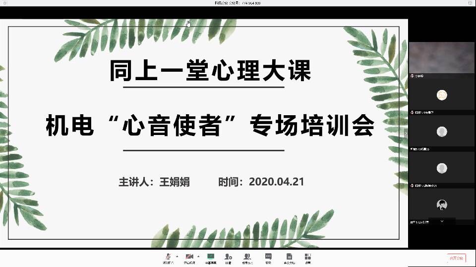 、班级、宿舍“四级”工作体系建设,提高朋辈助人、自助能力,提升学生获得感、幸福感、安全感,增强大学生心理健康素质,4月21日下午,针对18级、17级和16级开展了“同上一堂心理大课”----机电心音使者专场培训会。通过腾讯会议平台,共有520名心音使者参与培训,培训由机电 财神捕鱼