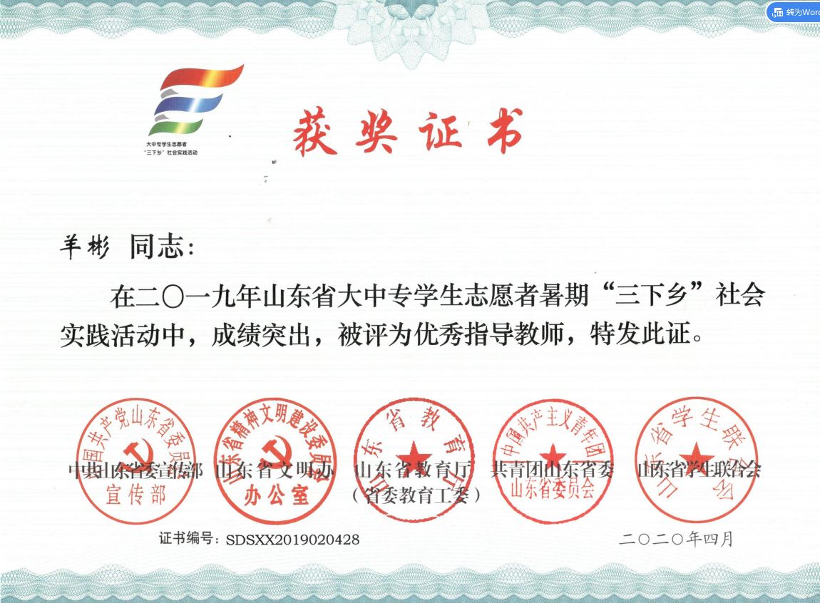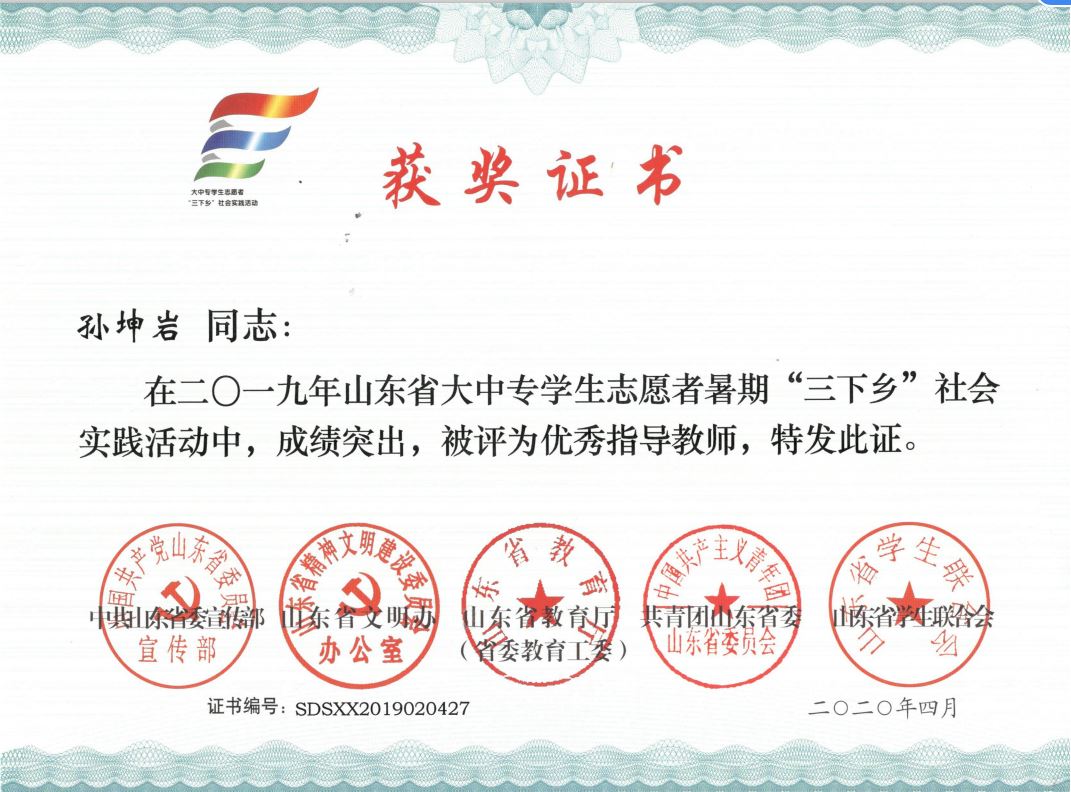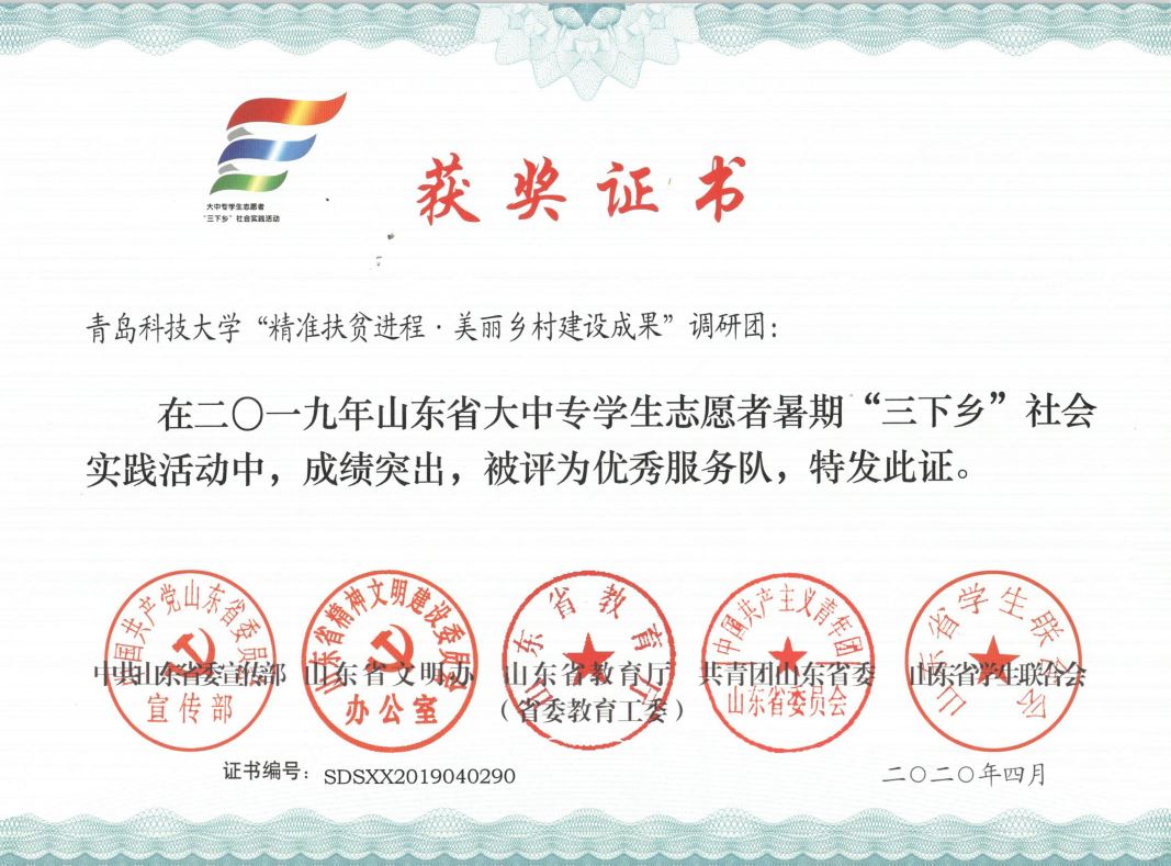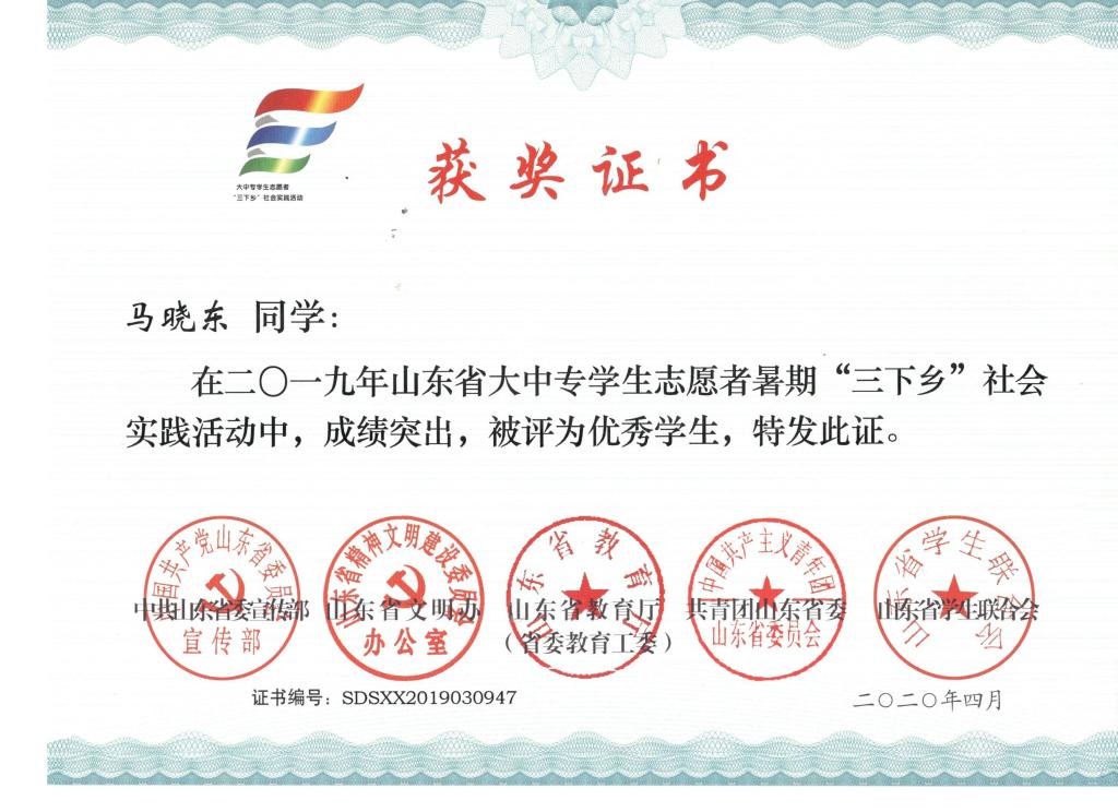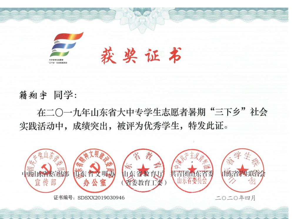 近日,2019年山东省大中专学生志愿者暑期文化科技卫生“三下乡”社会实践活动先进集体和先进个人的证书下发,机电 财神捕鱼 “ 财神捕鱼 精准扶贫进程 美丽乡村建设成果”调研团、获“三下乡”省级优秀服务团队,孙坤岩、羊彬获“三下乡”社会实践活动优秀指导教师,籍翔宇、张晓楠、范浩然、马晓东获 “三下乡”社会实践优秀学生。