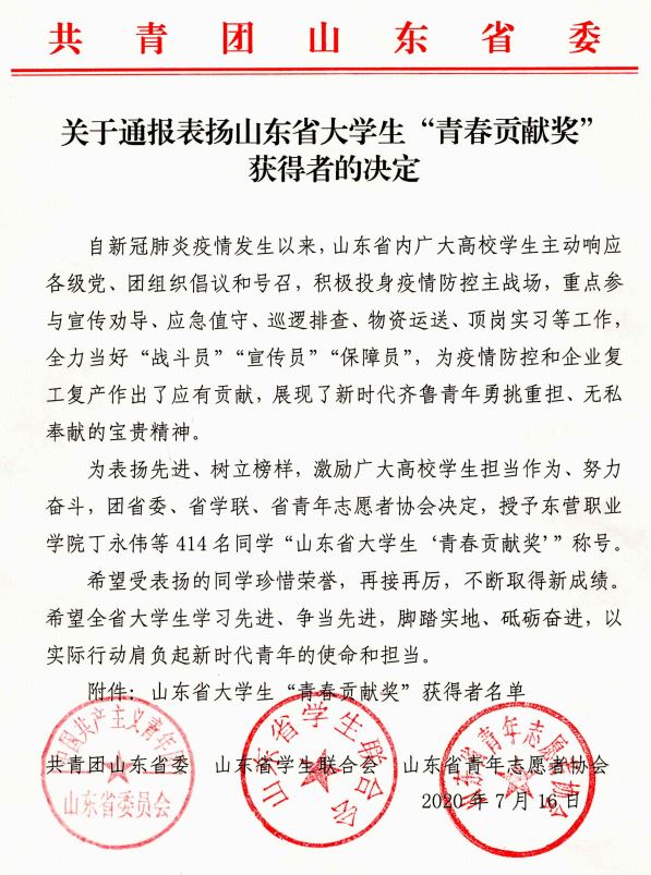 据悉,自新冠肺炎疫情发生以来,山东高校大学生主动响应各级党、团组织倡议和号召,积极投身疫情防控主战场。他们冲锋在第一线,战斗在最前沿,为山东省疫情防控和经济社会发展作出了重要贡献,展现了勇挑重担、无私奉献的宝贵精神。为深入贯彻落实习近平总书记“五四”寄语精神、给北京大学援鄂医疗队“90后”党员重要回信精神及疫情防控工作重要讲话和指示批示精神,进一步树立榜样、鼓舞士气、凝聚力量,团省委、省学联、省青年志愿者协会联合通报表扬了一批“青春贡献奖”人选。
