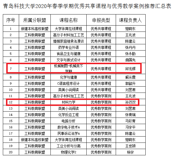 邱龙辉老师的《机械制图-机械类下学期》获评校优秀共享课程,孙双双老师的《材料力学》获评校优秀教学案例。