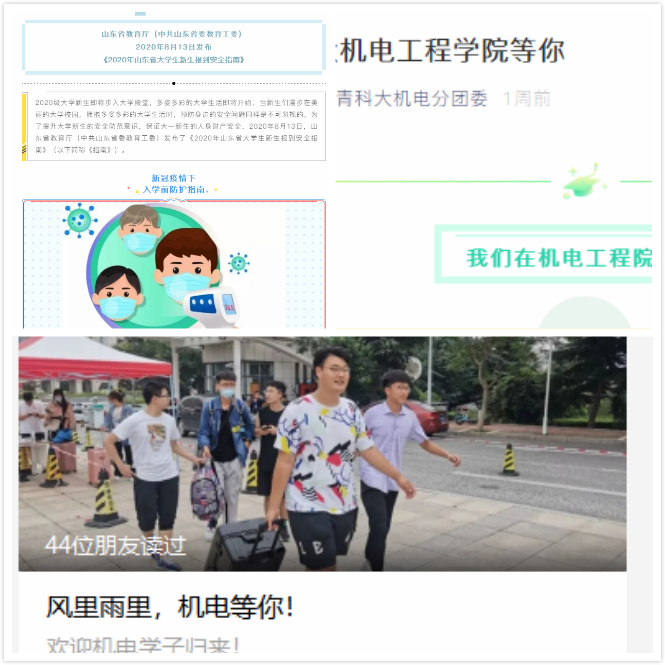 分团委微信公众号平台开设专栏,发表《大学新生报到安全指南》、《秋季开学十问》等,回答同学们的关切问题,帮助同学们安全、平安、有序返校。