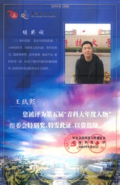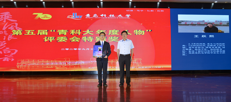 校友19届校友王跃熙获评第五届“青科大年度人物”评委会特别奖。他勇救落井工人,被中央电视台等媒体广泛报道。他先后获得“崂山区见义勇为先进个人”、“山东好人之星”等荣誉,并于2019年3月入选中央宣传部、中央文明办主办的中国好人榜。青年有担当,国家有希望。他的纵身一跃,彰显了新时代青年最美的模样。校党委学生工作部、学生工作处处长王锋业为王跃熙颁奖。