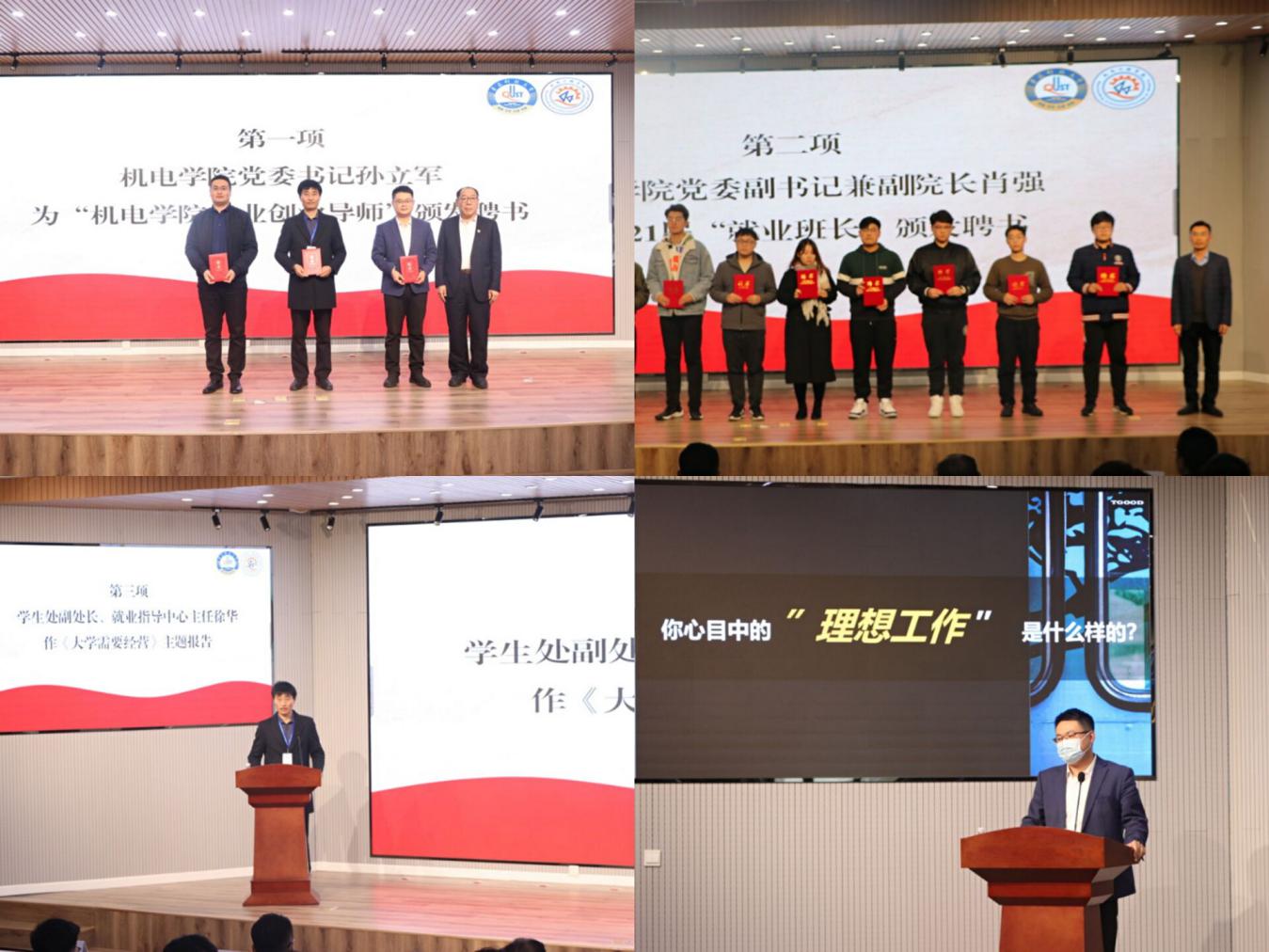 党委副书记兼副院长肖强为2021届“就业班长”颁发聘书,学生处副处长徐华作《大学需要经营》主题报告,青岛特锐德电气股份有限公司人力资源中心主任孟祥龙作《你就是求职路上那个最靓的仔》主题报告。毕业班辅导员王娟娟、王玉凯、于超在“就”赢未来——就业小讲堂上分别就《机电 财神捕鱼