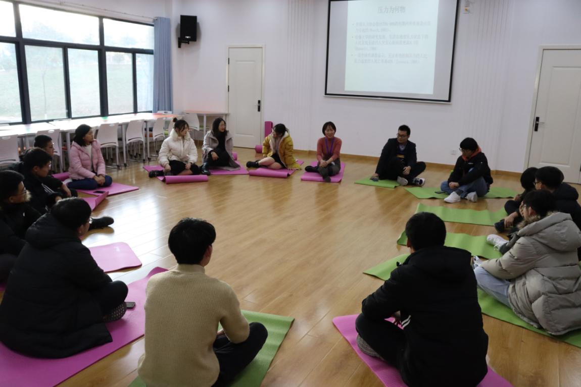 李海玲老师以“压力为何物”这一话题展开,从科学的角度系统的阐述了压力的定义,介绍了同学们压力的产生机制,强调建立良好心理品质的重要性;随后,李海玲老师组织同学们进行心理减压游戏——滚雪球,同学们依次介绍自己及自己考研目标院校并由下一个同学说出之前所有同学的信息;通过游戏引入减压的方法——STOP,带领大家了解并掌握这种减压方法,同学们通过肢体、呼吸放松进一步达到心理放松,体验释放压力的感觉。