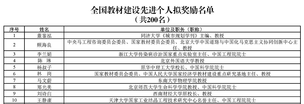 据悉,此次共评选出全国优秀教材1000种(基础教育类200种、职业教育与继续教育类400种、高等教育类400种)、全国教材建设先进集体100个、全国教材建设先进个人200名。