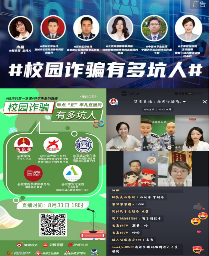 直播中,五位受邀嘉宾深入探讨了诈骗的几种手段,如何引导学生和家长提高防范意识,如何防范校园诈骗?讲解多发诈骗手段和防范知识,从源头上减少电信诈骗案发率,守护好学生钱袋子安全。于超作为受邀嘉宾中的唯一辅导员代表,用诈骗实例对诈骗的现状和防范做了介绍,详细介绍了冒充警察诈骗、冒充熟人诈骗、购物网站刷信誉诈骗、冒充购物网站客服诈骗、网络兼职诈骗等诈骗手段,并就如何辨识和防范上述诈骗行为给出了有效方法,引导学生牢记十二条防骗顺口溜。直播视频累计阅读量137.5万,此次直播是做好2021年秋季学期开学第一课,也是上好新生入学前教育第一课,为做好 财神捕鱼
