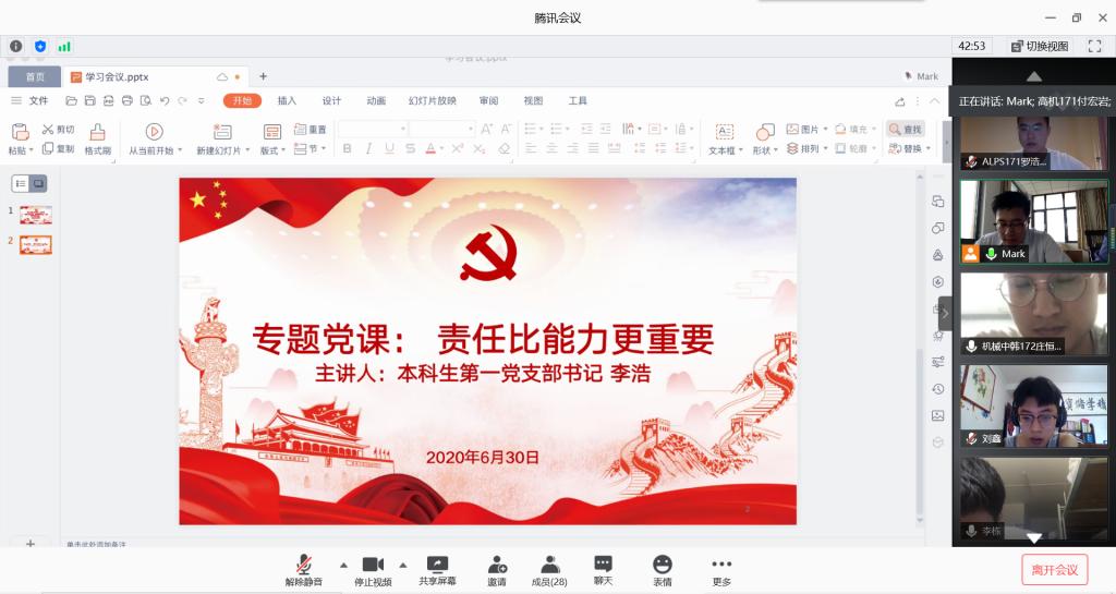 本科生第一党支部书记李浩在腾讯会议主讲“迎七一”专题党课。全体学生党员参加党课学习,会议由王玉凯老师主持。