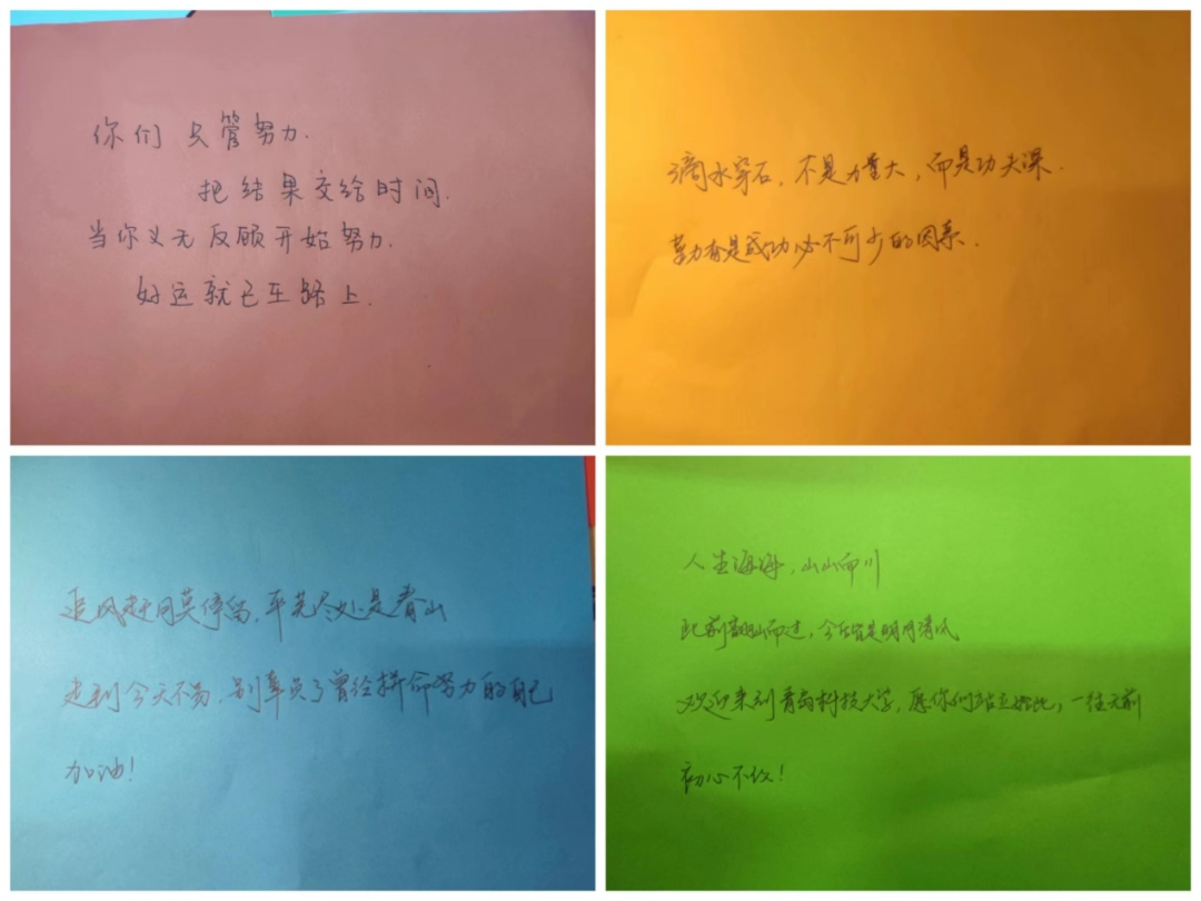 孙坤岩、王作辉、宋达、穆青青老师对新生们写下寄语,“师情献语暖人心”每一位老师都倾心呵护自己的学生,每一位老师都对自己的学生有无尽的言语要表达。由多位辅导员亲笔临写祝福语和期望话,表达对学生们的关切,也是希望同学们不辜负大学四年生活,通过现在努力,创造自己的美好未来。浏览完辅导员的寄语后,在场的每一位同学心中都涌入一股暖流,进一步巩固了师生情谊。