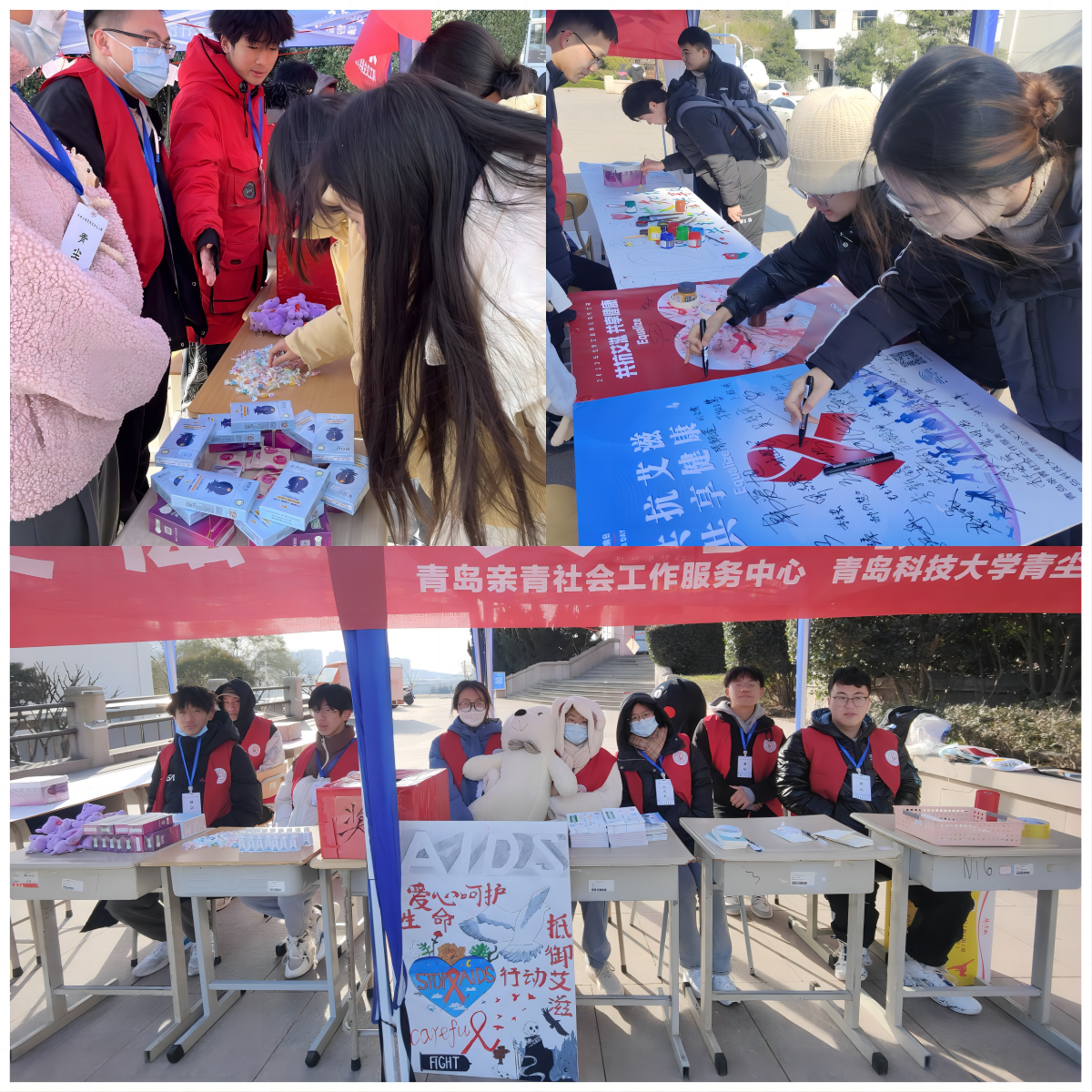 青尘义工队在南苑餐厅东门口开展了“共抗艾滋,共享健康”防艾主题宣传活动,宣传防艾知识,引导青科学子正视艾滋、关注艾滋、预防艾滋。