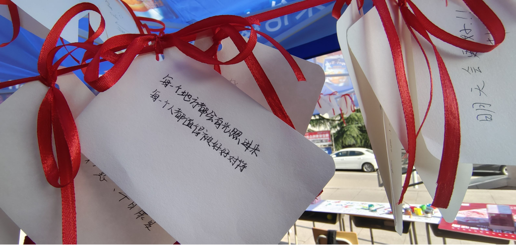 “红丝带”是一种希望的象征,代表着全世界对艾滋病感染者的支持与关心,在卡片寄语环节中,同学们将对艾滋病患者群体的美好祝愿写在小卡片上,并用红丝带系在帐篷下,风吹动小卡片将美好的祝愿转递出去,这更是同学们“手牵手同系红丝带,心连心共抗艾滋病”的象征。