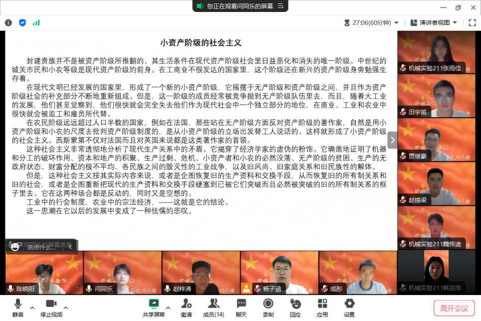 为深入学习宣传贯彻党的二十大精神,弘扬马克思主义理论,进一步加强思想政治教育,引导班级同学认真学习马列经典,提高思想政治素养,澄清信仰立场。机械实验211团支部于8月5日开展了主题为“学习马列经典,筑牢信仰根基”的研读活动。