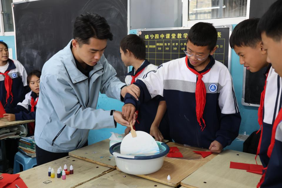 随后,志愿者们给孩子们播放相关视频的演示和解说,研支团成员袁俊杰等人引导学生进行实际的剪纸和大漆制作体验。过程中,研支团成员肖洋及张慧敏分别带领孩子们亲自动手体验苗族剪纸和大漆工艺,学生们积极参与、互相交流,展现出了极大的热情与创造力。同学们在老师的指导下,学习如何利用简单的工具与材料,创作出自己独特的剪纸作品和大漆器物。这一过程不仅培养了学生们的动手能力,更激发了他们对传统文化的热爱与认同。
