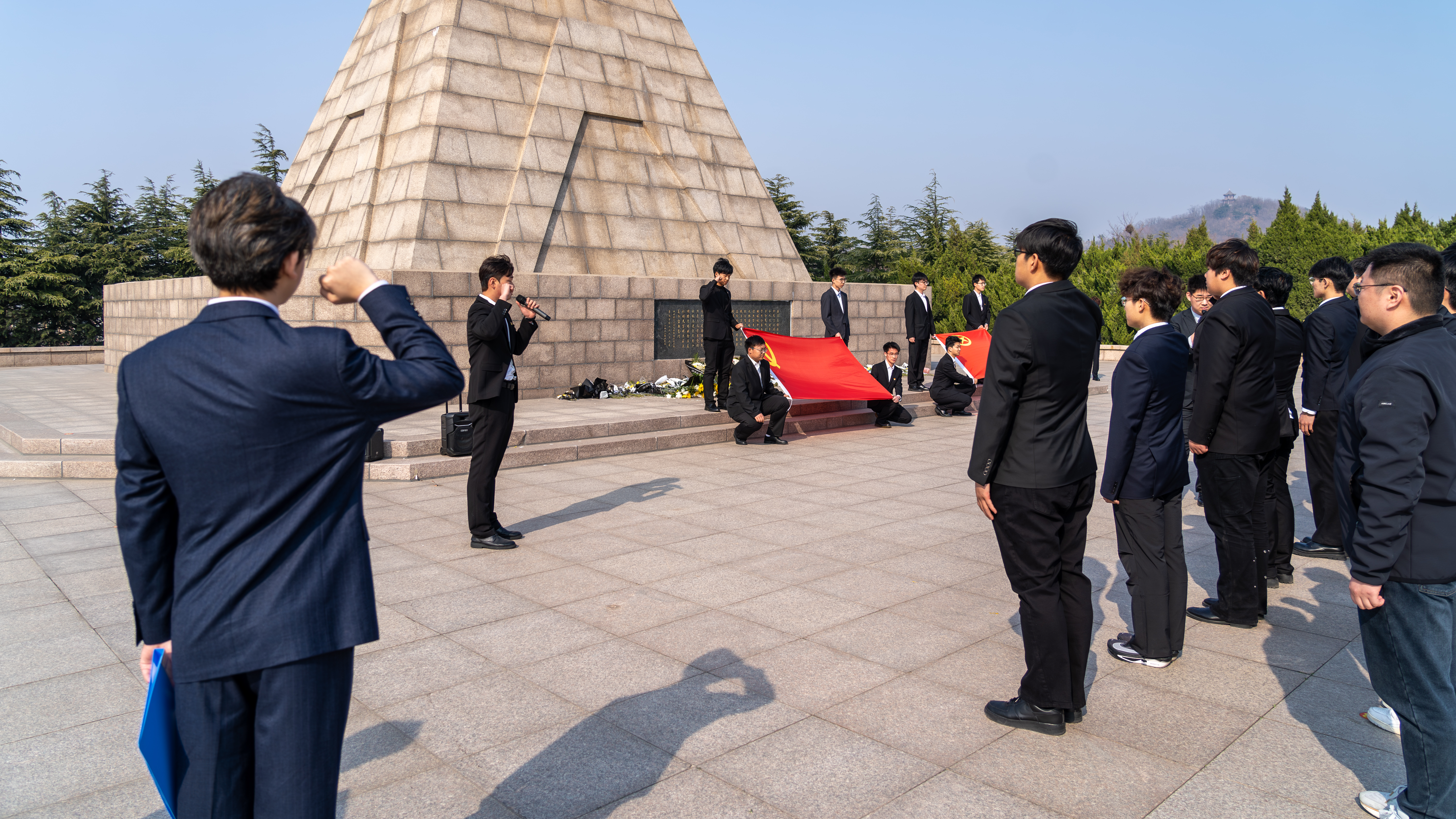 在烈士陵园中央的英雄纪念碑前,全体师生庄严肃立,默哀致敬,深切缅怀革命英烈的不朽功勋。随后,大家依次敬献鲜花,寄托哀思,表达崇高敬意。面对鲜红的党旗、团旗,全体党员、团员郑重地重温入党、入团誓词,铿锵誓言在陵园上空回响,告慰先烈,彰显了新时代机电青年的责任与担当。