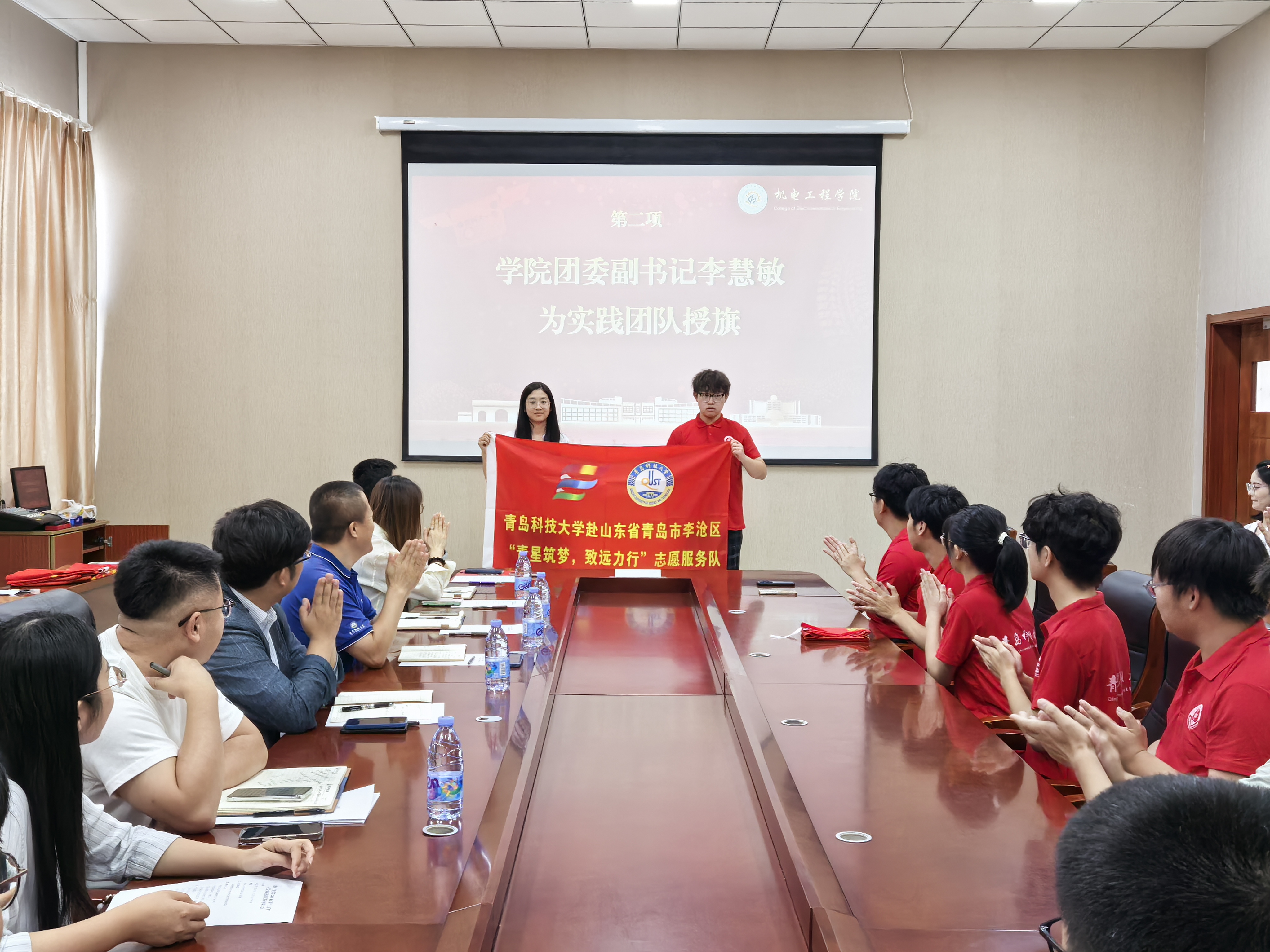 李慧敏、于超为即将奔赴一线的实践团队代表授旗,勉励同学们以昂扬的姿态投身社会实践,在火热的基层一线锤炼自我、服务社会。