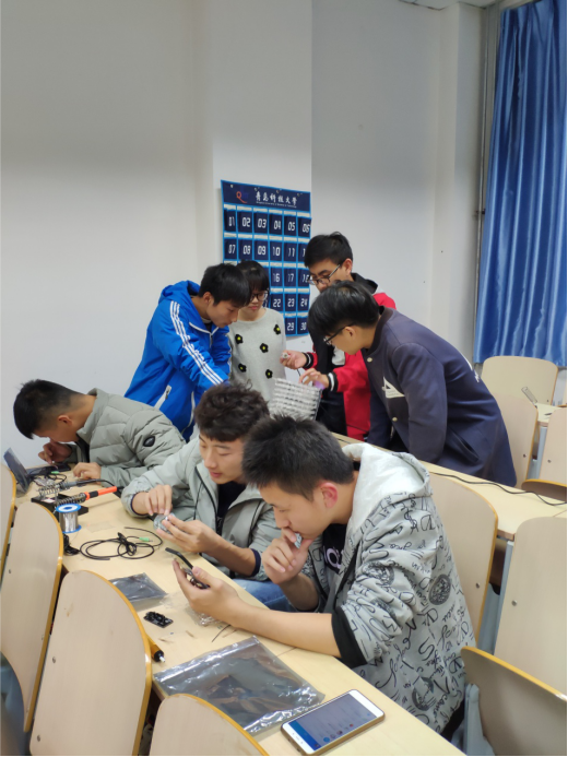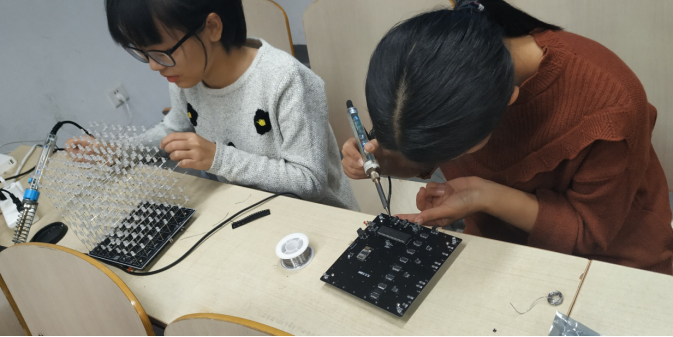 在焊接过程中,一个个七零八碎的小零件在同学们的手中被组合起来,虽然不同作品的焊接零件或顺序有所不同,但是其依据的电路基本原理是一样的。在焊接中,同学们难免遇到各种各样的困难,但他们并没有因为遇到的困难而放弃,而是积极的请求学长帮忙,或上网找资料。学长们也在一旁悉心的指导,同学们一直做到下课,仍然心无旁骛。在焊接时,同学们都互相借鉴,互相学习,共同探讨其中的原理,对焊接都有着极大的兴趣。同时,同学们的好奇心也得到了极大的满足。此次焊接活动将会持续到11月10号,并将举办一次成品评选活动。
