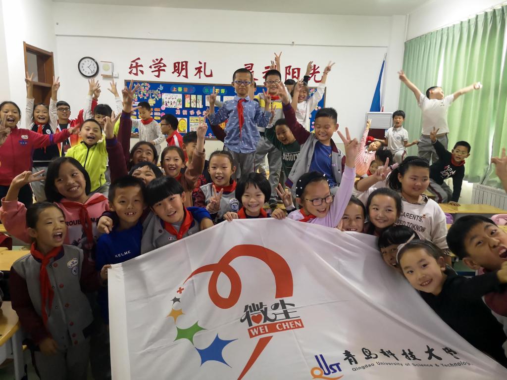 志工部微尘志愿者协会的志愿者们在10月22日到崂山区第三实验小学和朱家洼小学进行爱国主义教育。
