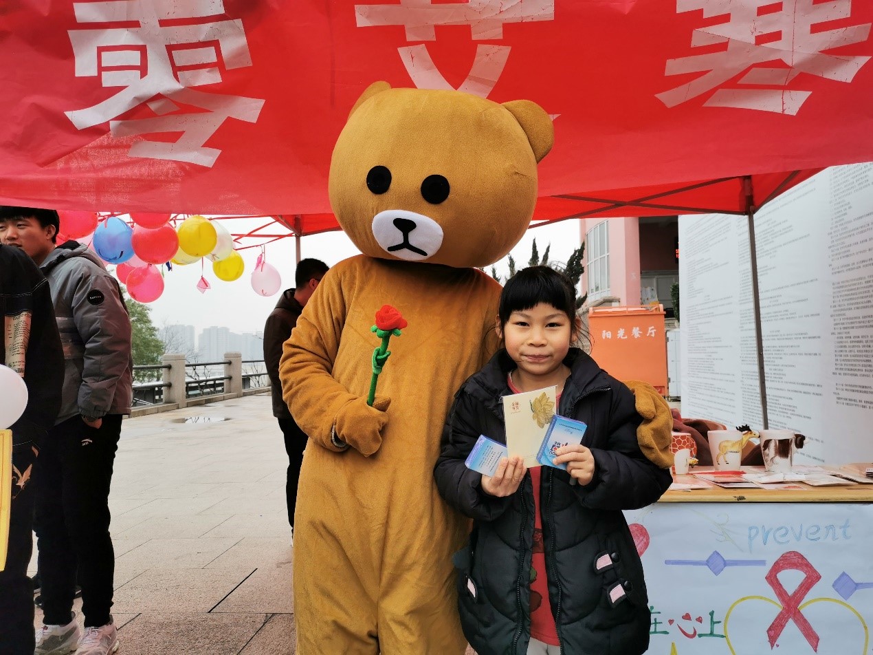 工作人员开始向来往的同学们宣传相关预防艾滋病的知识,在工作人员的指引下,同学们从零艾丝带上扎爆气球参与答题抽奖,拿出其中的艾滋病的相关问题,然后由工作人员告知其答案,最后同学们也写下了自己对艾滋病人的祝福。希望他们能创造奇迹,摆脱病痛,工作人员也给同学们发放了礼品并表示感谢。