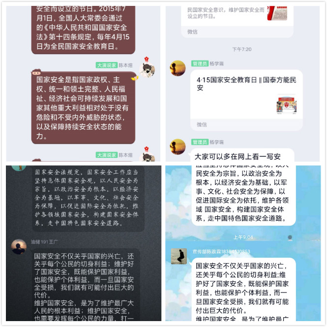 结合疫情防控工作,以国家安全教育为主题组织各班级、团支部召开 “云”班会、线上主题团日活动,组织在班级群内探讨国家安全知识,做到互学互帮互促,提升学生的国家安全意识。