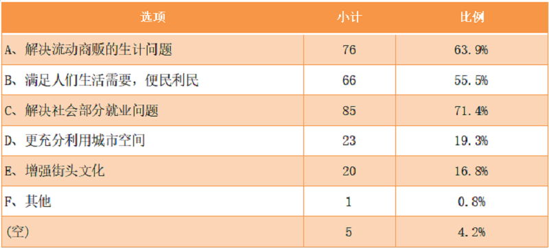 从调查问卷调查结果来看,对流动商贩有需求的主要原因是流动商贩提供的商品价格便宜、购买方便、能满足生活的需要,受调查者对流动商贩的需求是多种多样的,涉及食品、生活、学习等各方面,其中以对食品类需求量最大(占29.93%)。受调查者认为地摊商贩存在的合理性是:解决地摊商贩的生计问题、满足人们生活需要、解决社会部分就业问题。